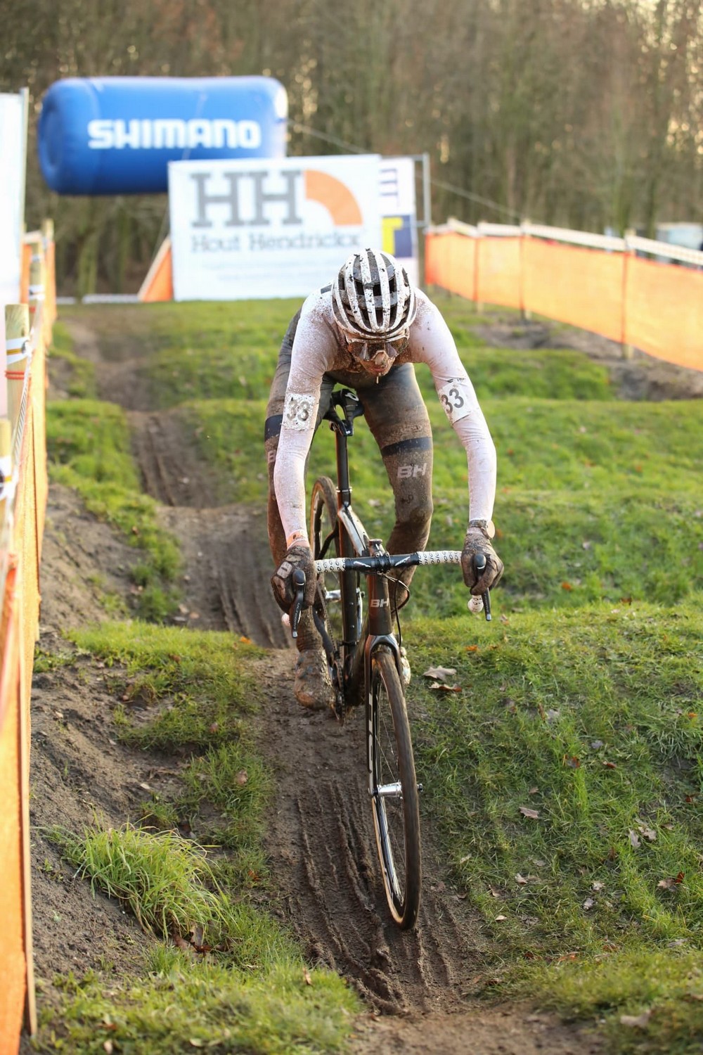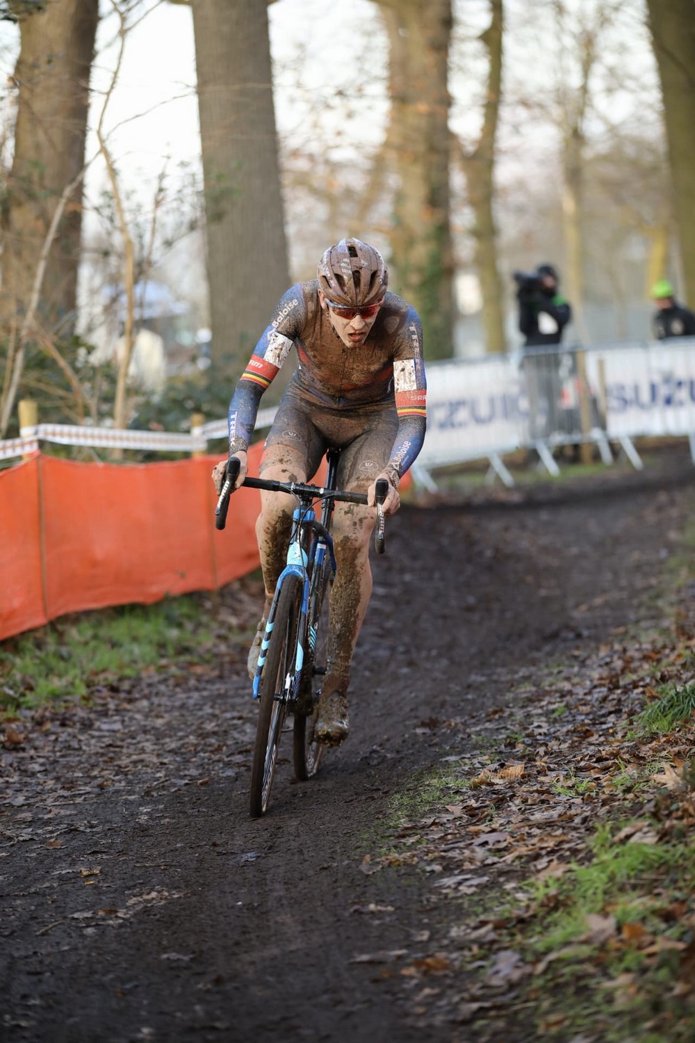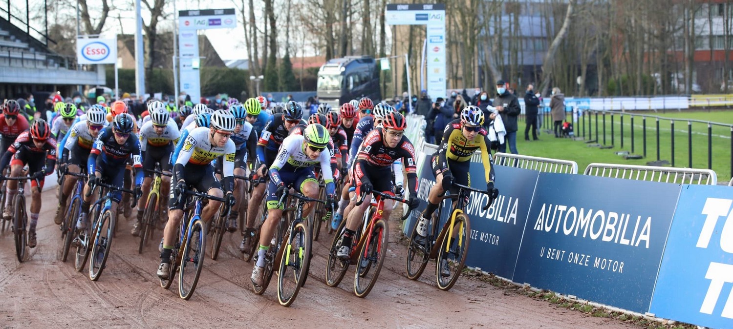 Sur un circuit remis au goût du jour à Meulebeke, avec des collines et passages techniques destinés à bousculer les meilleurs représentants belges, la course masculine s’annonçait encore plus complexe à gérer que l’épreuve féminine suite à un dégel qui rendait les chemins du parc Ter Borcht encore plus glissants. Cela se confirmait dès le sprint de lancement, autour du terrain de football du KFC Meulebeke : les visages et maillots de tout le peloton étaient déjà remplis de boue, et quelques glissades mettaient la pagaille dès ce premier tour. Dès la première colline, Wout van Aert était ainsi contraint de mettre pied à terre face à ces chemins glissants, et bloquait tout le reste du peloton derrière, dont Michael Vanthourenhout et le champion d’Europe Eli Iserbyt (Pauwels Sauzen-Bingoal), deux grands favoris au titre national.