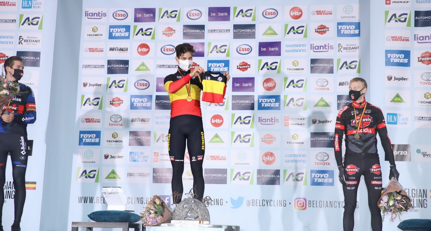 Wout van Aert (Jumbo-Visma) a conquis à Meulebeke son quatrième titre de champion de Belgique de cyclo-cross au terme d’une course parfaitement gérée. Même le bon démarrage de Laurens Sweeck (Pauwels Sauzen-Bingoal) n’a pu perturber la course en solitaire du champion de Belgique du contre-la-montre, désormais également en noir-jaune-rouge dans les labourés.