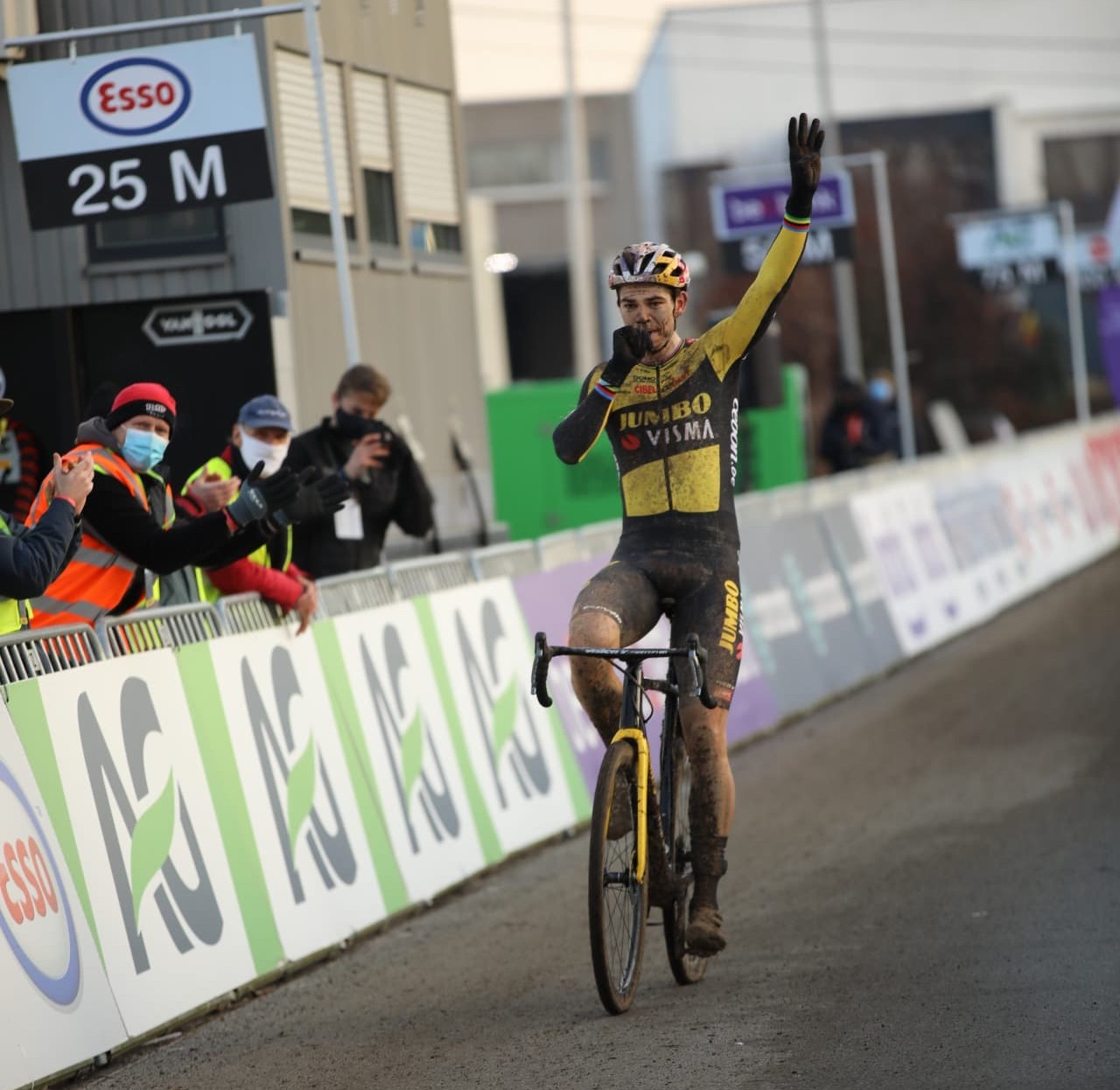 Car Wout van Aert ne faisait aucune erreur technique après avoir pris la tête de l’épreuve, et restait solidement installé à la première place. Même si Aerts revenait en force dans les derniers tours, après avoir fait sauter Vanthourenhout, visiblement rincé par ses efforts de début de course, la victoire était bien pour le favori du jour. Le doigt dans la bouche, l’autre main affichant quatre doigts, Wout van Aert célébrait sur la ligne tant la naissance de son premier enfant, Georges, né en début de semaine, que son quatrième titre de champion de Belgique de cyclo-cross chez les pros.