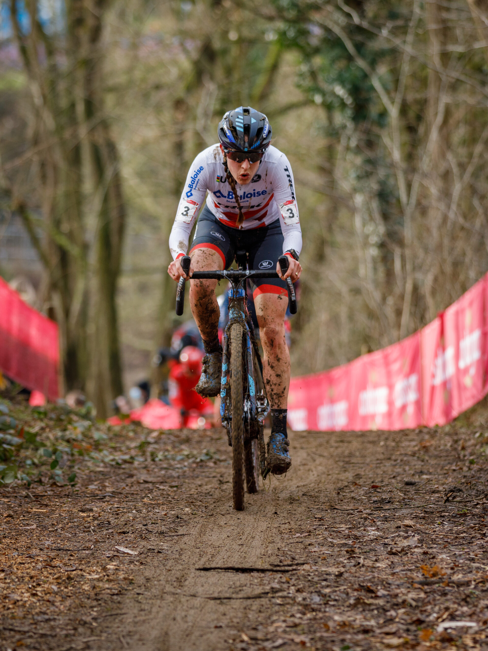 Alvarado réalisait un petit écart sur ses rivales, avant une glissade qui l’envoyait contre une corde censée délimiter le parcours. Heureusement, cette corde touchait plutôt le haut de son torse, plutôt que sa gorge… « J’ai eu la chance de pouvoir me retenir contre la corde, sinon elle m’aurait touchée plus bas. C’est là que j’ai eu de la chance », se rassurait la Néerlandaise après l’épreuve. Cette erreur permettait à Brand, mais aussi Manon Bakker (Credishop-Fristads) voire la championne américaine Clara Honsinger (Cannondale CX Team), autrice comme à son habitude d’une remontée étincelante, de revenir sur la tête de course. Alors que Betsema reculait au fil de glissades qui se voulaient très pénalisantes sur ce tracé vallonné.