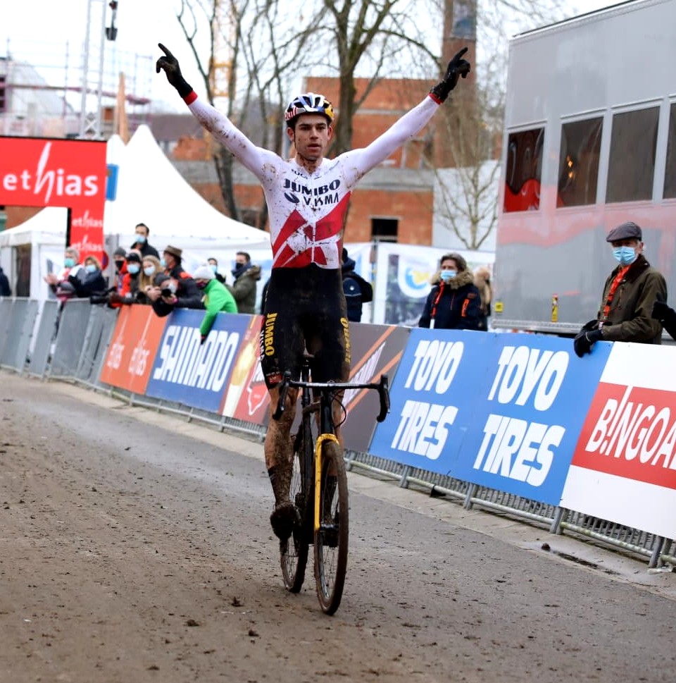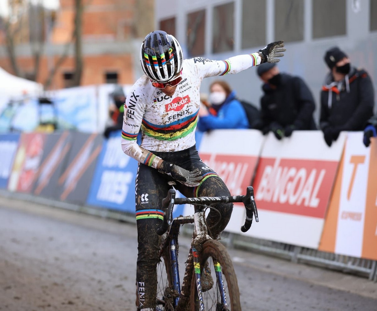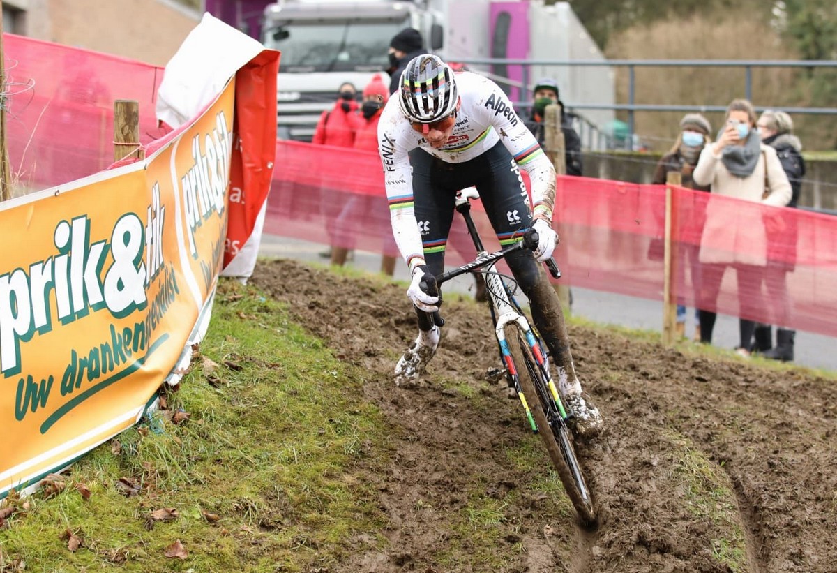 Wout van Aert avait le temps de célébrer, debout sur sa machine, sa deuxième victoire en Coupe du monde cette saison. Elle lui assure la victoire finale au classement général de la Coupe du monde, la troisième de sa carrière. Surtout, il prend un certain ascendant psychologique avec ce succès convaincant, avec près d’une minute d’avance sur son habituel adversaire batave. « Cela me donne quelque chose de plus au niveau mental pour la semaine prochaine. Mais je pense que Mathieu a montré ces dernières semaines qu’il est le favori », décrit Van Aert, qui veut s’enlever une certaine pression des épaules avant les championnats du monde à Ostende, dimanche prochain. « Je pense que c’est du 50-50. J’ai été meilleur ce samedi (NDLR : à Hamme), mais je ne suis pas encore au niveau que je souhaiterais« , rapporte pour sa part le tenant du titre, conscient qu’il sera sur le sable ostendais l’homme à suivre face à l’armada belge, qui comptera neuf hommes grâce au succès de Van Aert.