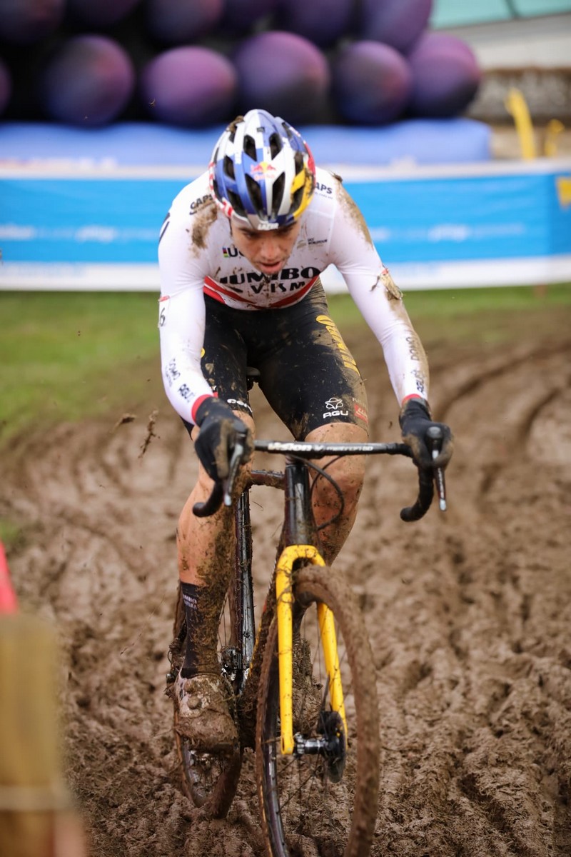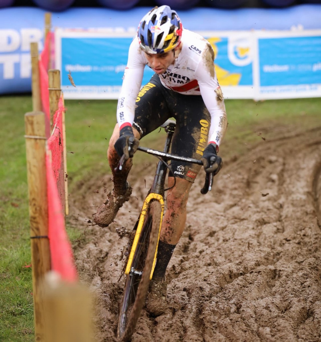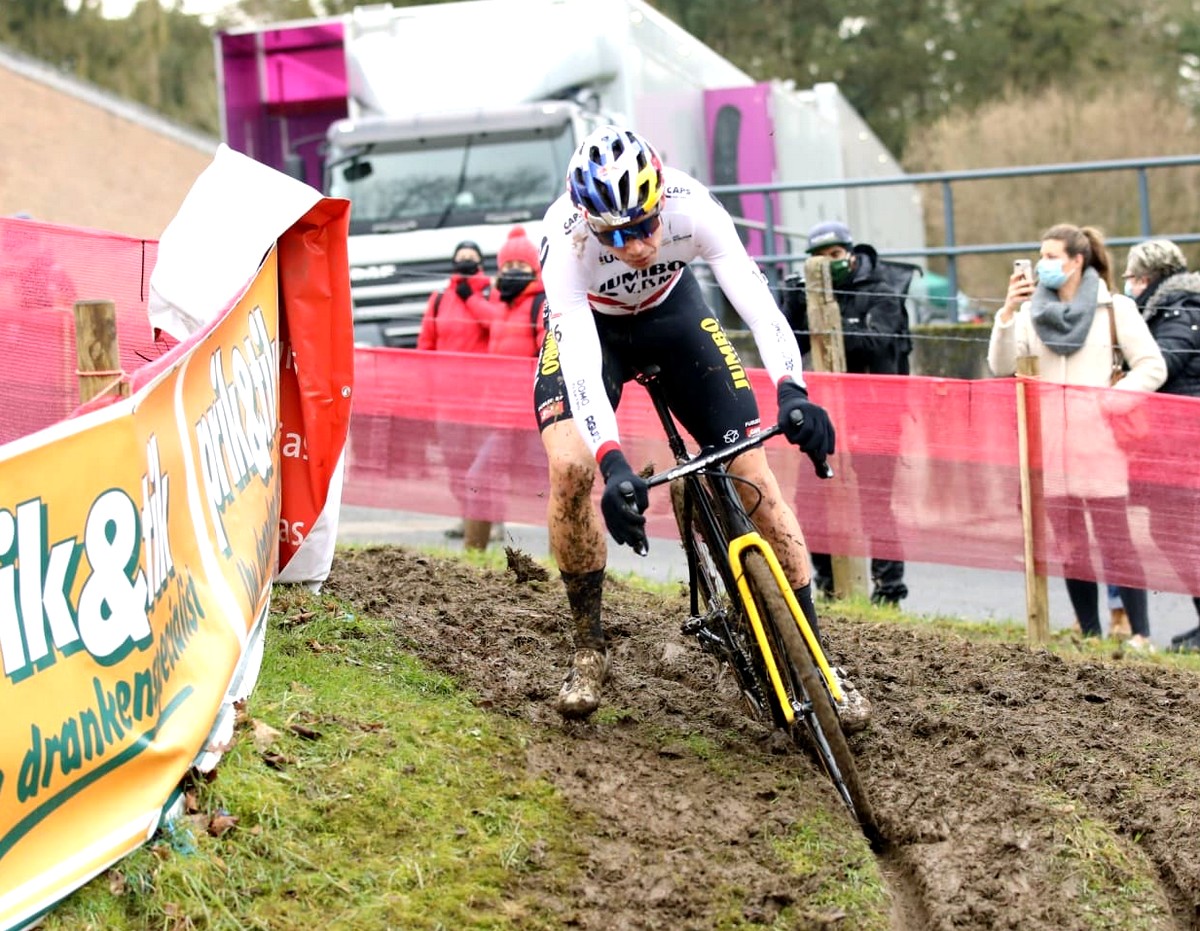 Le duel était déjà intense entre les deux leaders, jusqu’à la fin du deuxième tour : Van Aert prenait alors la poudre d’escampette, pendant que Van der Poel traînait dans la boue. Les caméras confirmaient la malchance du champion du monde à son arrivée sur le macadam : une crevaison de la roue arrière le contraignait à laisser filer son rival belge. Une montée du Ter Nood plus tard, Van der Poel filait alors à toute vitesse pour essayer de retrouver la roue arrière du leader, pointé à une vingtaine de secondes à la sortie du poste de changement de vélo. Et le Néerlandais réussissait presque sa mission… Dans le même tour, Van Aert était victime d’une chute qui lui coûtait une dizaine de secondes. « Cela restait un cyclo-cross délicat. Suite à cette chute, je n’étais jamais à l’aise sur le vélo, Mathieu était très proche et je devais essayer de l’empêcher de rentrer », explique le leader de Jumbo-Visma après la course.