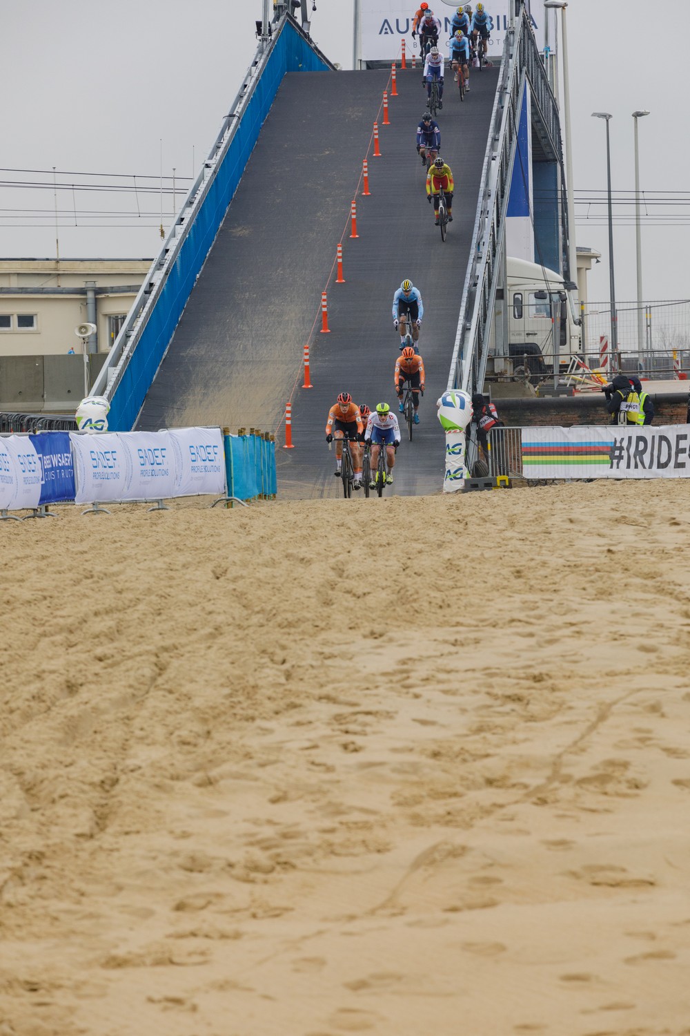 Le Belge Niels Vandeputte était également victime d’un soleil dans la descente du pont, alors que le Britannique Thomas Mein subissait pour sa part le pouvoir de la pluie sur l’escalier prévu en fin de course. Un endroit où Kamp glissait également lourdement en deuxième partie de course. Plusieurs voix se faisaient d’ailleurs entendre sur les réseaux sociaux et le plateau de Sporza, après-course, pour demander un tapis antidérapant sur ces marches devenues patinoire au fil de l’après-midi.