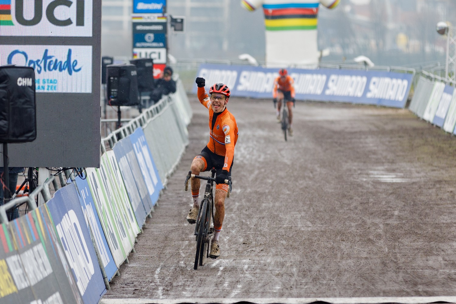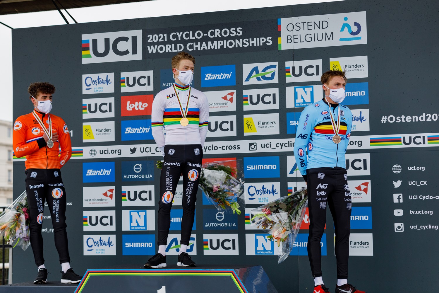 Mais l’homme de tête tenait bon et filait sur l’ultime ligne droite en imitant l’oiseau s’envolant vers l’arc-en-ciel : « Je n’y ai pas vraiment cru jusqu’au dernier tour. Quand j’ai vu la ligne et que j’ai vu derrière moi Ryan (Kamp) en deuxième position, j’ai su que c’était bon. C’était une très belle course », souriait Pim Ronhaar, tout en détente après son premier titre mondial, lui qui avait déjà conquis un maillot de champion d’Europe chez les juniors voici deux hivers. Il s’impose ce samedi face à Kamp, alors que Timo Kielich complète le podium, en tant que meilleur représentant belge devant le tout jeune Verstrynge.