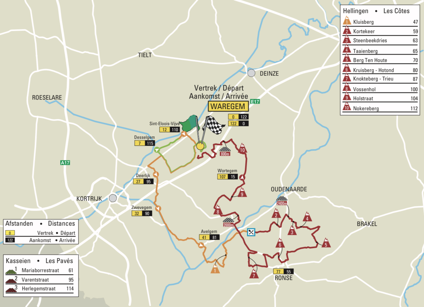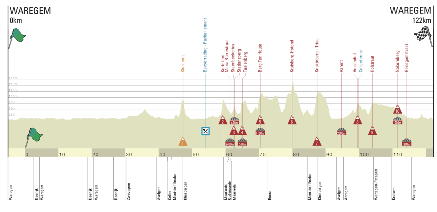 Le peloton devrait ensuite se briser à nouveau sur le Kruisberg, grande nouveauté du parcours, à près de 40 bornes de l’arrivée, avant un enchaînement de côtes moins abruptes mais éreintantes au fil des « bergs ». Le circuit se terminera également par le Nokereberg, à 10 kilomètres de la ligne, avant un dernier passage sur le secteur pavé de la Herlegemstraat, à huit kilomètres du but.