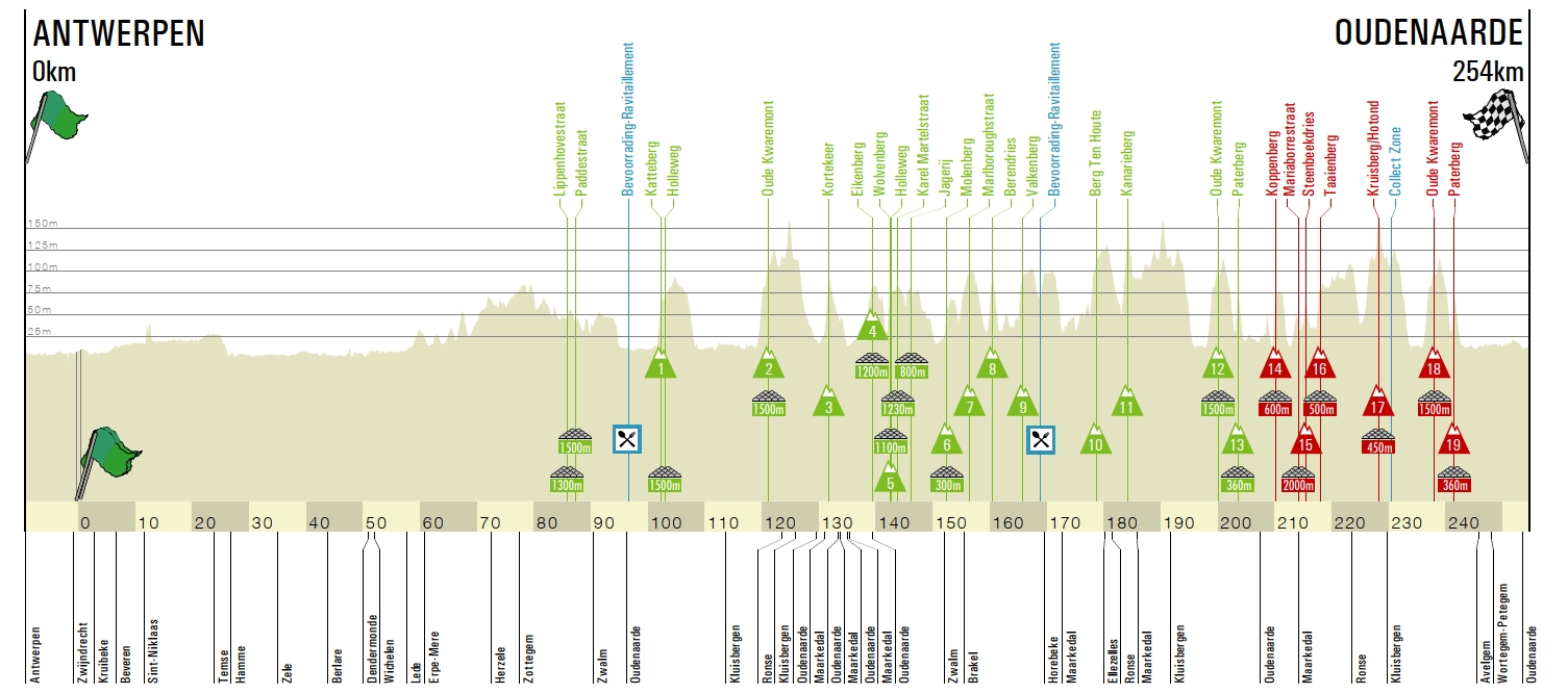 L’organisation a tout de même légèrement corsé le tracé de cette 105e édition, avec l’ajout de deux côtes pour user un peu plus les cuisses à l’approche d’Audenarde. Après un long cortège dans la plaine via Beveren, Saint-Nicolas et Zottegem, les coureurs découvriront les premiers pavés sur la Lippenhovestraat et la Paddestraat, deux secteurs mythiques des courses flandriennes, avant de se préparer les jambes sur les pentes du Katteberg, première ascension de la journée pointée à 150 kilomètres de l’arrivée. La première des trois montées du Vieux Quaremont interviendra une vingtaine de bornes plus loin, pour permettre aux favoris de prendre leurs premiers repères sur les pavés cassants de cette longue colline à travers les champs.