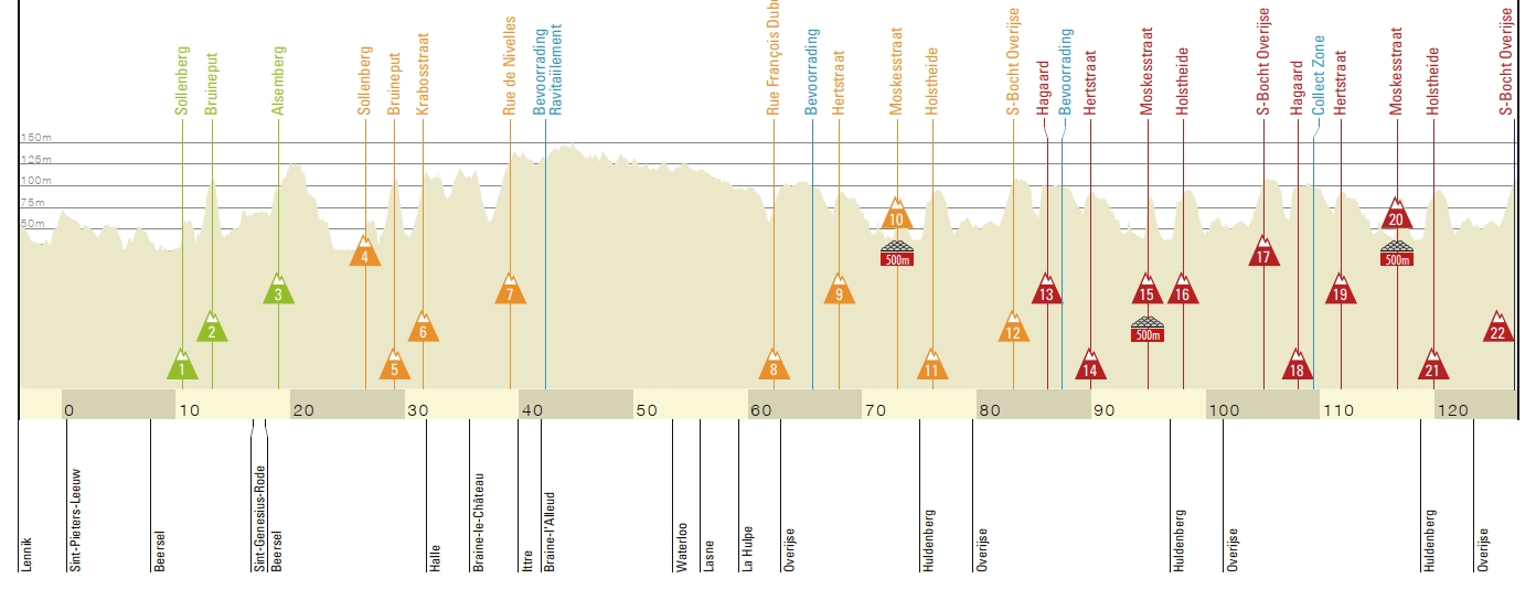Le Schavei sera cette fois évité, et l’arrivée sera tracée dans les deux derniers kilomètres au sommet d’une nouvelle montée, sur la chaussée de Bruxelles. La pente se fera plus douce que sur le Schavei, mais plus irrégulière également, ce qui permettra certainement une course offensive et plus intrigante. Avec 22 ascensions répertoriées et près de 130 kilomètres au programme, les puncheuses seront attendues sur ces routes vallonnées.