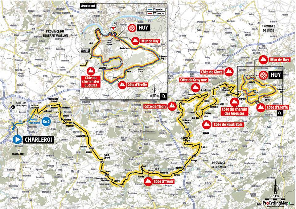 Cette boucle hutoise n’aura toutefois pas de secret pour le peloton, du moins pour les coureurs ayant déjà participé à l’édition 2020. Après le Mur de Huy et son faux-plat qui suit vers Strée, le peloton descendra vers la côte d’Ereffe pour une première montée dans les battements par minute. Après une descente sinueuse, place à la côte du Chemin des Gueuses, la nouveauté de la saison dernière, avec une pente aisée jusqu’à son final, plus pentu. Le faux-plat qui suit le sommet de cette avant-dernière ascension de la journée peut également jouer des tours au peloton, avant la glissade jusqu’à Huy, où se situe le pied du Mur, pour les 1300 derniers mètres les plus rudes de la journée. Après le virage Claudy Criquielion, et en cas d’arrivée groupée, les 300 derniers mètres s’annoncent comme les plus intenses.