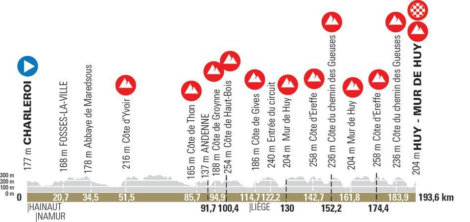 La Flèche Wallonne retrouvera son point de départ à Charleroi, à l’occasion d’une édition qui s’annonce plus vallonnée qu’à l’accoutumée. Il n’est plus question de prendre des longues nationales sans aspérité pour rejoindre Huy et son célèbre Mur. Après un départ du Hainaut, les côtes vont s’enchaîner jusqu’à la région mosane. Cela ne va pas forcément aiguiser l’appétit d’attaquants qui se rendent bien compte qu’une offensive à près de 100 bornes de l’arrivée n’aurait pas d’intérêt, mais cela pourra clairement user les jambes à l’aube du circuit final. Ainsi, les côtes de Thon, de Groynne, de Haut-Bois et de Gives, pourront déjà fatiguer, avant une première ascension du Mur de Huy, qui annonce le passage sur le circuit final, à parcourir à deux reprises.