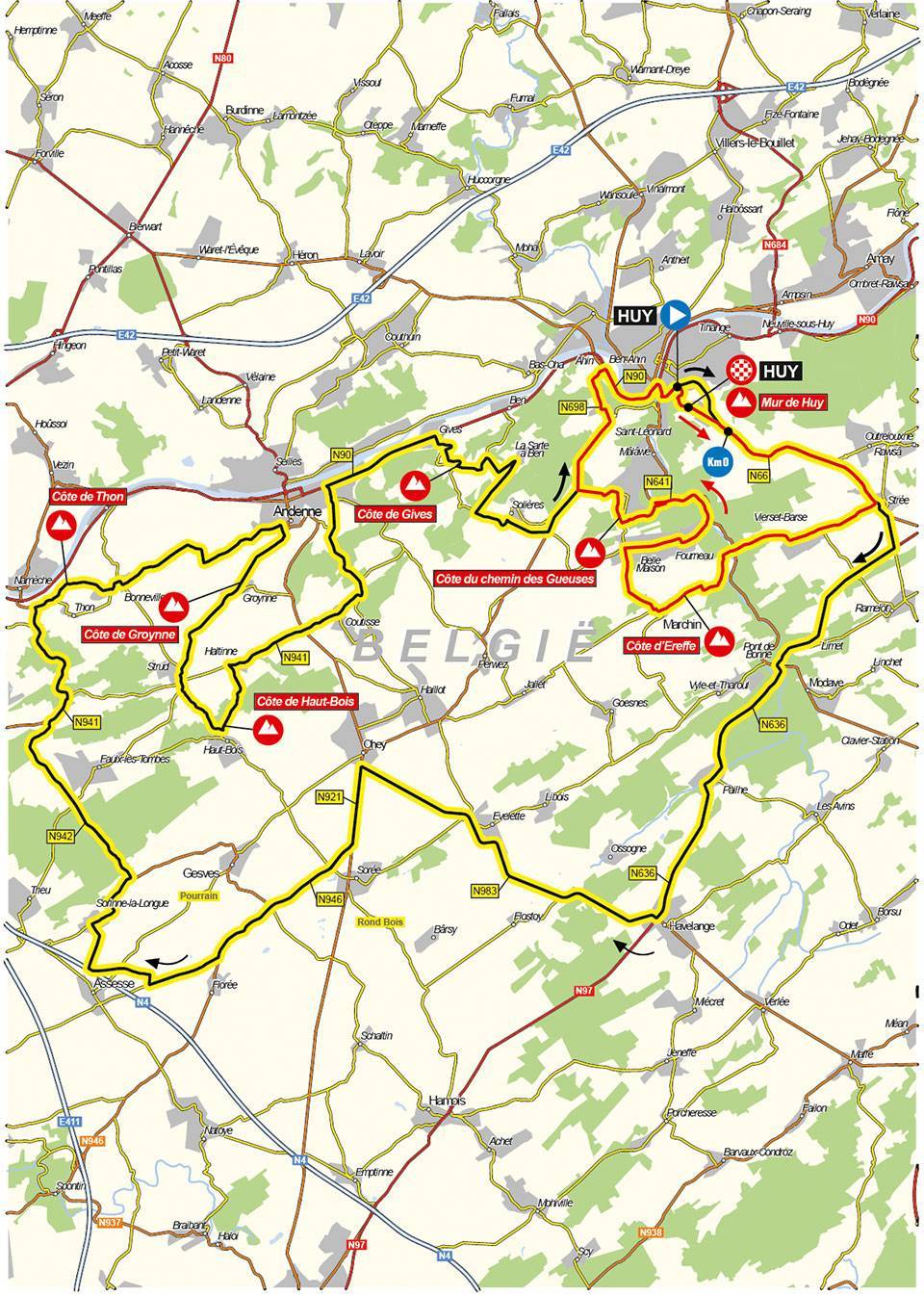 Cette Flèche Wallonne aura des allures de véritable classique ardennaises, cette saison, avec un enchaînement de côtes plus intense que ces dernières années. Surtout, le peloton féminin accompagnera plus longtemps le parcours de leurs homologues masculins. Si elles éviteront la côte d’Yvoir, située trop loin de Huy pour imaginer un circuit intéressant, les partantes entameront leur ascension à la mi-course avec l’enchaînement des côtes de Thon, de Groynne, de Haut-Bois, et de Gives, dans la région d’Andenne, avant le circuit local tracé autour du Mur de Huy.