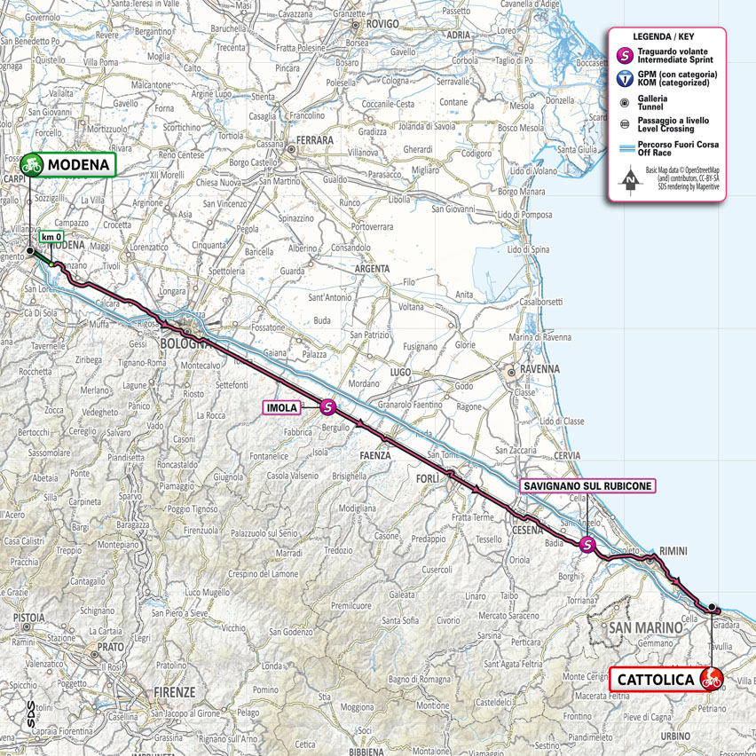 Le peloton va dérouler sur la via Emilia vers la mer Adriatique, pour une très longue ligne droite jusqu’à Cattolica. Les coureurs passeront par Bologne, Imola, Cesena et Rimini en contournant toutes les collines qui font d’habitude le sel de ces régions. Le final sera toutefois dangereux en vue du sprint massif qui s’annonce. Dans les 3 derniers kilomètres, les virages à angle droit vont s’enchaîner avec un dernier tournant dangereux à 900 mètres de la ligne d’arrivée.