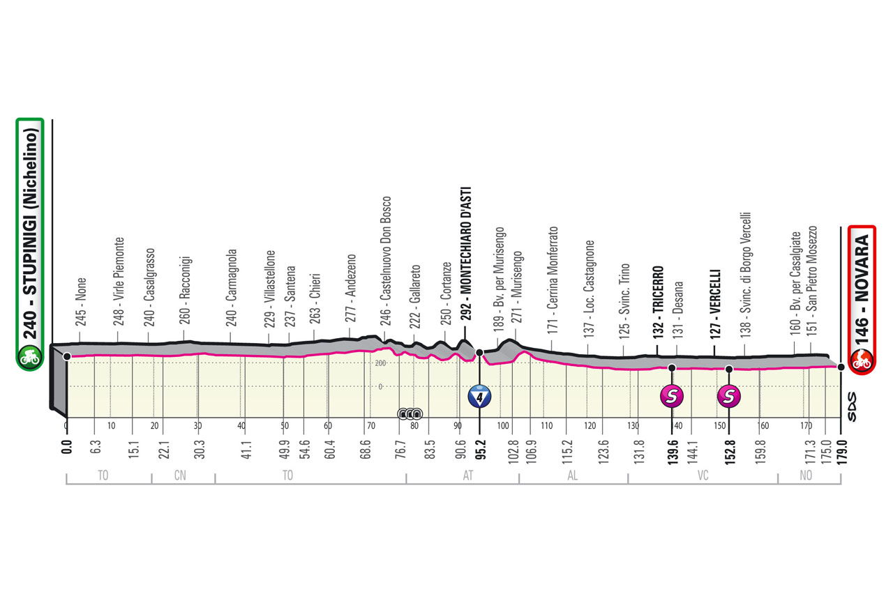 Cette première étape en ligne sera idéale pour les sprinters. À travers les plaines du Pô, les coureurs traverseront en milieu d’étape les quelques collines de la région d’Asti, sans toutefois s’attendre à du vélo-champagne. Car la finale sera toute plane, avec un dernier kilomètre sans grand danger, si ce n’est un léger virage à droite qui pourrait surprendre les candidats à l’emballage massif, surtout au terme d’une deuxième journée de course qui s’annonce nerveuse.