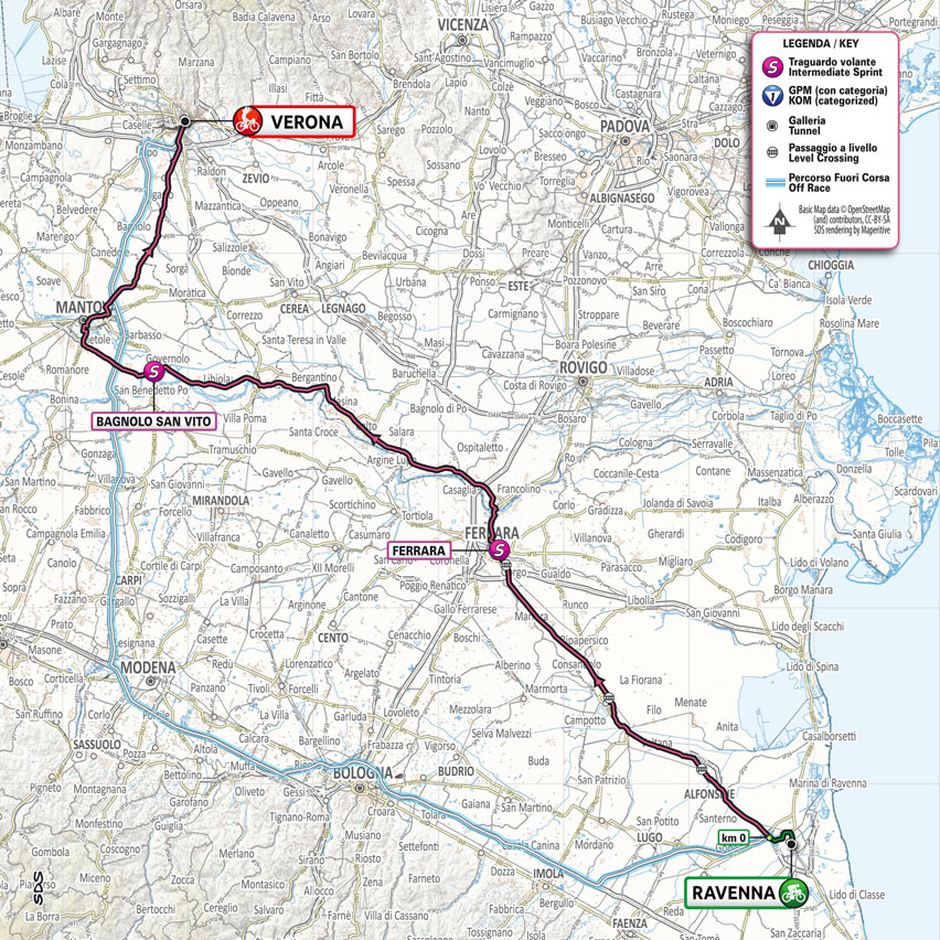 Voici l’étape au dénivelé le plus léger de ce 104e Giro. Entre Ravenne et Vérone, aucune difficulté s’annonce et les longues lignes droites faciliteront le travail du peloton sur ces 200 kilomètres tracés pour les purs sprinters. La dernière ligne droite, elle-même, fait plus de 3 kilomètres, c’est dire. Cela permettra également aux grimpeurs et candidats au maillot rose de se dégourdir les jambes avant le lourd menu montagneux du prochain week-end.