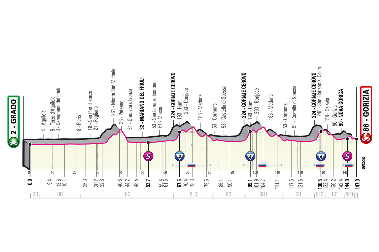 Cette courte étape emmènera le peloton en Slovénie, pour un circuit entre les deux pays qu’il faudra affronter à trois reprises. La montée de Gornje Cerovo, très abrupte (jusqu’à 15%), permettra aux attaquants de tenter leur chance, avant l’arrivée vers Gorizia, à la frontière slovène. Une petite butte fera la différence pour la victoire d’étape dans les 4 derniers kilomètres, avec une côte d’un kilomètre à 5,9% de moyenne et une section à 15%, dont le sommet est situé à trois bornes du but.