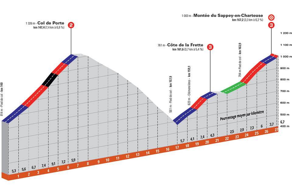 Les Alpes s’approchent. Le Critérium du Dauphiné entre dans sa phase finale à l’occasion de cette 6e étape qui annonce trois cols à escalader en moins de 50 kilomètres. Après une centaine de bornes dans la plaine, le peloton entamera ses premières pentes via le col de la Placette, une ascension de près de 6 kilomètres idéale pour se mettre en jambes avant le plus raide col de Porte, dont les passages à 10% ne sont pas rares. Dans le parc de la Chartreuse, pas le temps d’admirer les cimes, il faudra déjà descendre pour enchaîner les deux dernières ascensions de la journée, moins de dix kilomètres plus loin. Place d’abord à la côte de la Frette, avant un léger replat menant au village du Sappy, au bout de 3,3 kilomètres à 6,2% de moyenne.