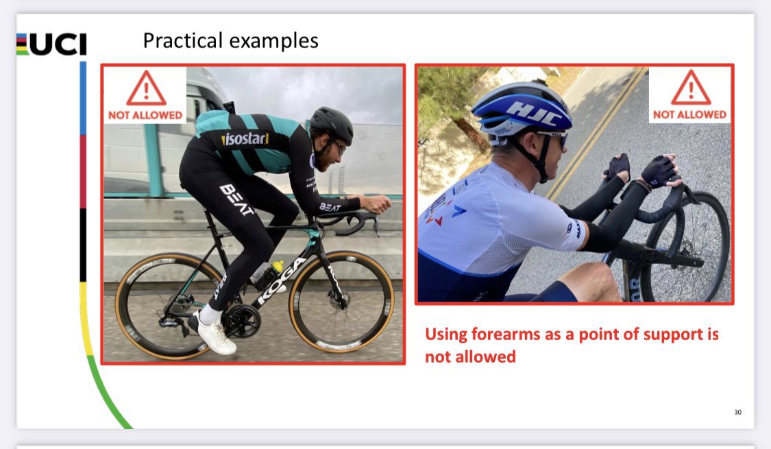 Jan-Willem van Schip et son équipe ont voulu jouer avec le règlement, ils n’ont finalement pas eu gain de cause. Le règlement était pourtant clair, et la position proposée par Van Schip est bien une de ces positions interdites illustrées dans les exemples de l’UCI, en avril dernier.