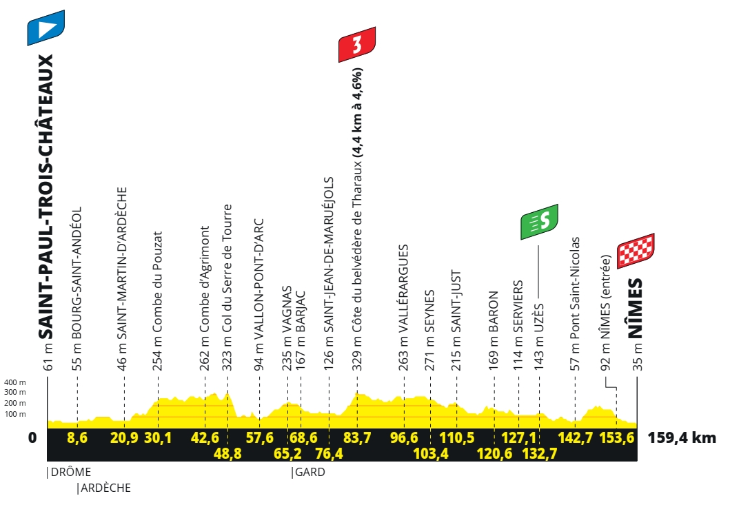 Un peu de répit pour les coureurs à l’occasion de cette nouvelle étape de transition entre la Drôme et le Gard. Le peloton n’évitera pas les buttes d’Ardèche et les quelques côtes sinueuses qui mèneront à Nîmes, mais celui-ci devrait rouler groupé à l’approche de la cité du Gard. Le public pourra pour sa part profiter des superbes vues sur les gorges de l’Ardèche, avant d’assister à un sprint massif annoncé d’avance. À moins que des attaquants sentent la socquette légère à l’aube de cette journée de récupération.