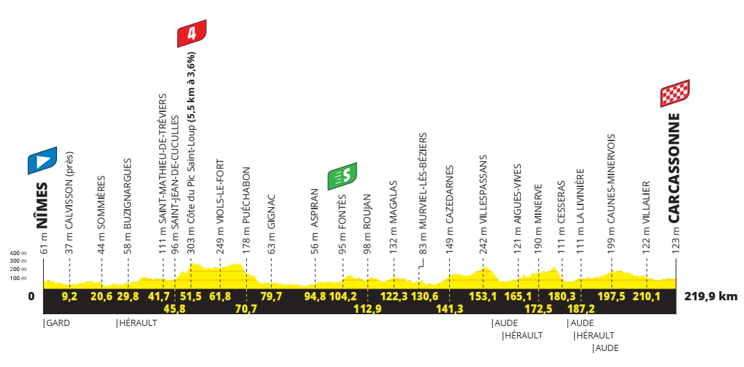 À l’approche des Pyrénées, il faut encore enquiller du kilomètre pour se placer au pied des montagnes franco-espagnoles. Avant de songer à l’altitude, il faut filer à toute berzingue sur les routes élancées de l’Hérault et de l’Aude. Sur plus de 200 kilomètres, cette étape ne présente pas de grande difficulté en termes de dénivelé. Mais le vent peut être un danger supplémentaire sur ces chemins exposés. Le peloton devra foncer pour éviter les mauvaises surprises à l’approche de Carcassonne.
