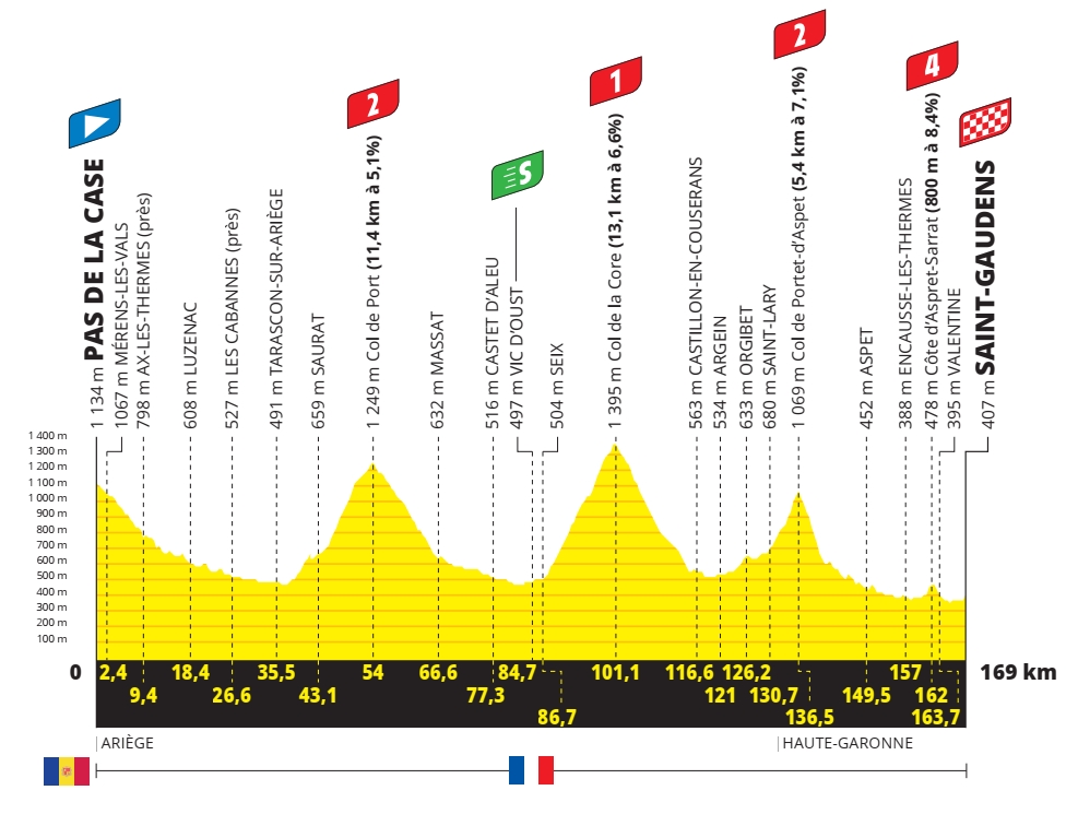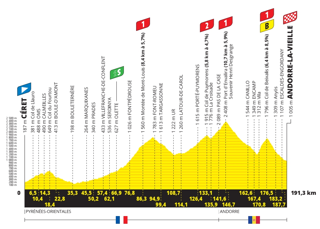 Les favoris au maillot jaune entameront pour leur part une bataille sur le Port d’Envalira, à l’entrée dans la Principauté d’Andorre, le seul col situé à plus de 2 000 mètres d’altitude sur cette étape. De nombreux grimpeurs s’entraînent sur ces pentes, ils sauront donc comment surprendre ceux qui n’ont pas l’habitude des bosses andorranes. Car le col de Beixalis, qui s’annonce comme juge de paix de la journée, sera raide, sinueux et étroit, avec plus de 8,5% de moyenne sur plus de 6 kilomètres et des passages à 12% au pied. La descente sera ensuite rapide jusqu’à Andorre, capitale de la Principauté, où le classement général devrait connaître de nouveaux changements majeurs avant la deuxième journée de repos.