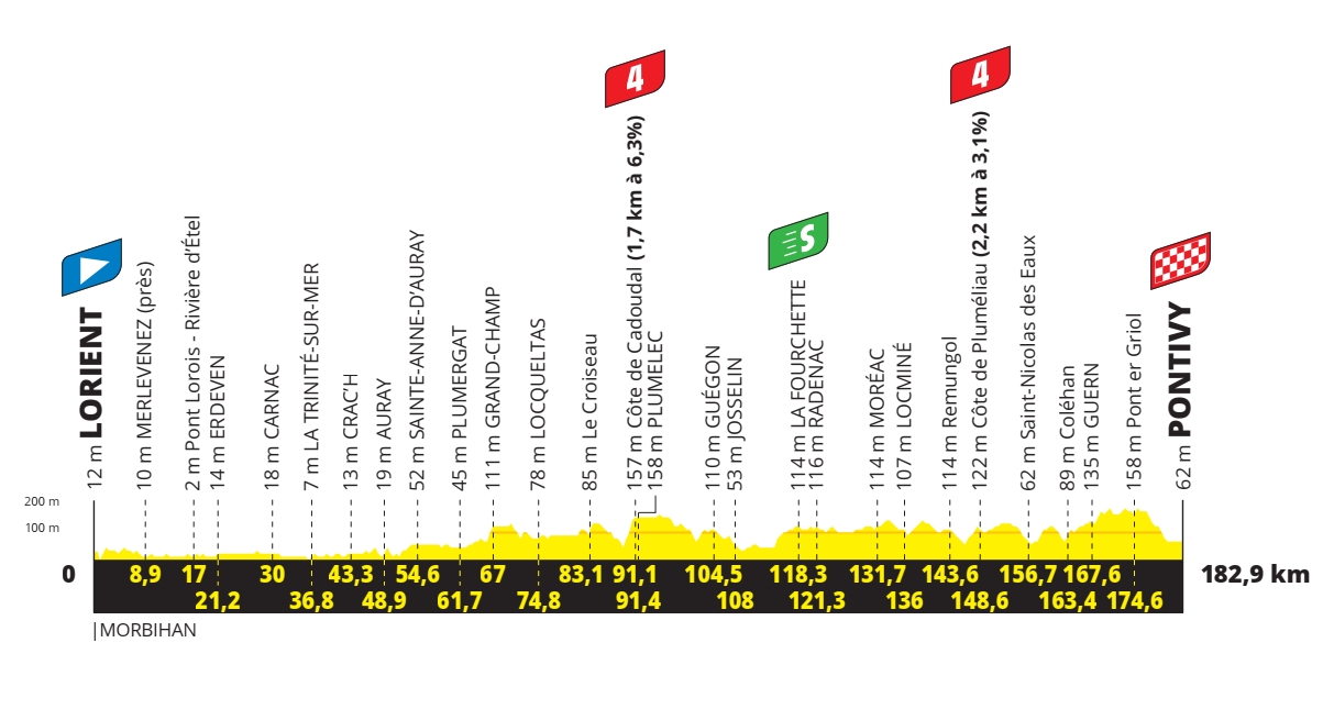 Cette troisième étape bretonne peut s’annoncer plus aisée que les deux précédentes, à la lecture simple du profil. Cette course dans le Morbihan n’aura rien d’une promenade pour les sprinters, qui devront s’arracher avec leurs équipiers pour maintenir un peloton complet jusqu’à Pontivy. Car les montées ne vont jamais cesser depuis la célèbre côte de Cadoudal, arrivée du GP de Plumelec, à moins de 90 kilomètres de l’arrivée.
