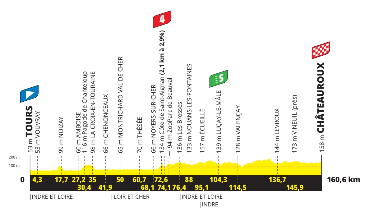 Les mauvaises langues affirmeront qu’il s’agit là de l’étape typique d’une première semaine de Tour de France des années 1990 ou 2000. Certes, l’étape sera courte avec seulement 160 kilomètres au compteur, mais les routes seront larges et longues jusqu’à Châteauroux. Attention tout de même aux 50 derniers kilomètres qui peuvent être exposés au vent et favoriser des bordures. Et à l’aube d’étapes de montagne qui pourraient faire des dégâts, certains favoris et/ou outsiders pourraient se sentir inspirés. Et si rien ne se passe, attendez-vous à un sprint sur des chaussées taillées pour ce type d’effort. Rien de dangereux dans le final, il faudra juste songer à sa place parmi les premières positions du peloton.