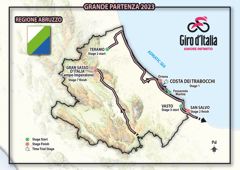 C’est la deuxième fois que le Giro partira des Abruzzes, vingt-deux ans après une première expérience qui avait célébré Rik Verbrugghe, vainqueur du contre-la-montre le plus rapide de l’histoire du Giro : 58,874 km/h sur 7,6 kilomètres entre Montesilvano Marina et Pescara. Depuis lors, le Tour d’Italie a enchaîné les passages dans la région avec quatre arrivées au sommet consécutives ces quatre dernières années, comme Campo Felice en 2021 (victoire d’Egan Bernal) ou le Blockhaus en 2022 (succès de Jai Hindley).