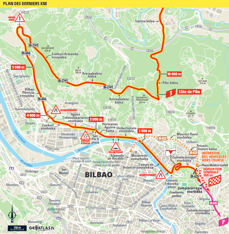 Ce sera bien cette catégorie de coureurs qui sera attendue ce samedi pour le final dans les rues de Bilbao, à nouveau. Dans les trente derniers kilomètres, deux côtes raides mettront en difficulté les moins costauds. D’abord la côte de Vivero et ses quatre bornes à plus de 7% de moyenne, une ascension assez régulière. Avant une descente vertigineuse vers l’aéroport de Bilbao, où le peloton découvrira la dernière montée du jour. La côte de Pike propose 2 km à 10%. Cependant, elle se veut graduelle : le premier kilomètre ne grimpera pas à plus de 7% avant un final à 12 puis 16%. Le sommet sera pointé à moins de dix kilomètres de l’arrivée, annonçant une descente légèrement technique et rapide jusqu’au centre de Bilbao. La route ressemblera à celle de la descente finale de Liège-Bastogne-Liège, sur deux bandes. En cas de pluie, celle-ci peut se révéler dangereuse…
