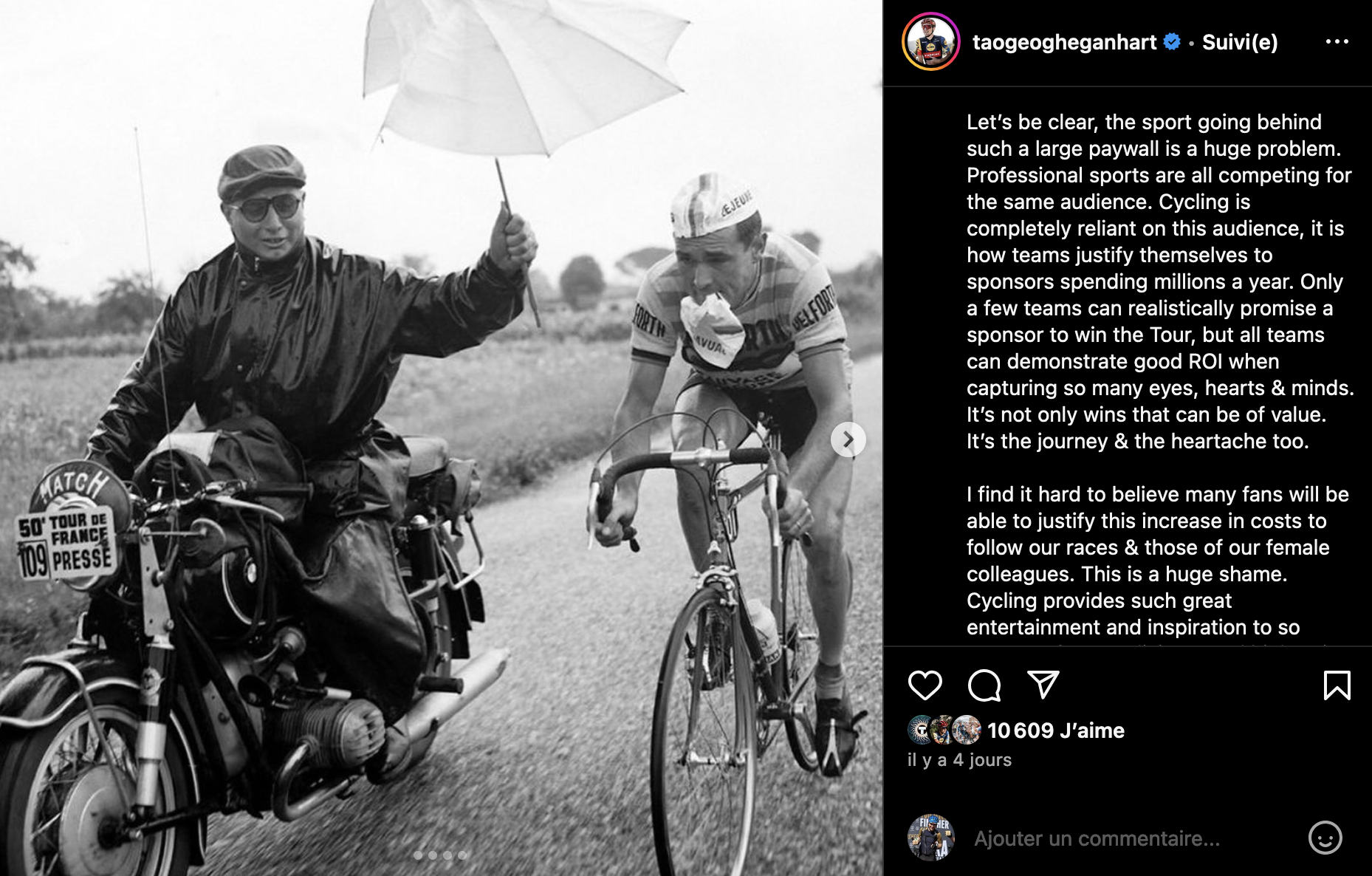 L’inquiétude est évidemment grande parmi la communauté cycliste britannique que ces nouveaux prix prohibitifs fassent finalement plus de mal que de bien au vélo. L’ancien vainqueur du Giro Tao Geoghegan Hart s’est lui-même fendu d’une publication sur Instagram pour déplorer cette décision de Warner Bros. Discovery : “Tous les sports sont en compétition pour la même audience”, rappelle le sociétaire de Lidl-Trek. “Je pense qu’il est maintenant très pertinent de se rendre compte où va l’argent (des droits télévisés) et où il ne va pas. Et peut-être de remettre en question le monopole autour de la couverture sportive au Royaume-Uni”, a-t-il ajouté.