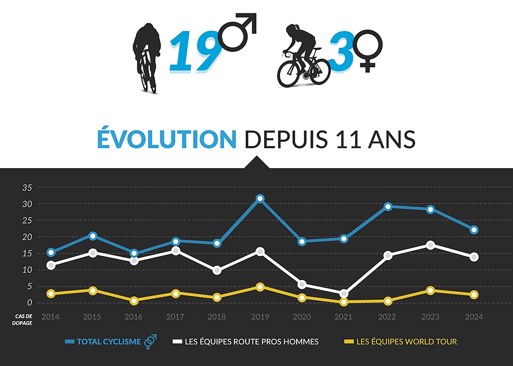 - Le Mouvement Pour un Cyclisme Crédible (MPCC) a présenté son habituel baromètre du dopage, reprenant les cas de triche tant dans le cyclisme que dans d’autres sports professionnels. Il apparaît que l’athlétisme reste encore et toujours le sport le plus touché par les cas de dopage avec 161 cas positifs sur l’année 2024, devant l’haltérophilie (72) et la force athlétique (63). Le cyclisme (route, piste, VTT, BMX, paracyclisme) reste loin de ces sphères, en neuvième position avec 20 cas positifs sur la dernière saison. Cela signifie une baisse du nombre de cas depuis le dernier pic en 2022, mais cela reste plus élevé qu’en 2020, 2021 ou avant 2018 (NDLR: le MPCC tient le relevé de ces données depuis 2014). Le mouvement s’inquiète toutefois de nouvelles pratiques qui mettent à mal la crédibilité du sport. Le mantra “Tout ce qui n’est pas interdit est autorisé”, “attise malheureusement la suspicion sur nos athlètes et notre sport”, déplore le MPCC, qui appelle donc à des règlements plus stricts sur certaines pratiques.