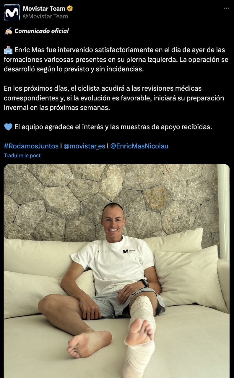 - L’Espagnol Enric Mas (Movistar), sur la touche depuis son abandon sur le Tour de France, a été opéré la semaine dernière d’une phlébite à la jambe gauche, a révélé son équipe sur X. Il espère pouvoir reprendre dans les prochaines semaines sa préparation hivernale pour la saison prochaine.