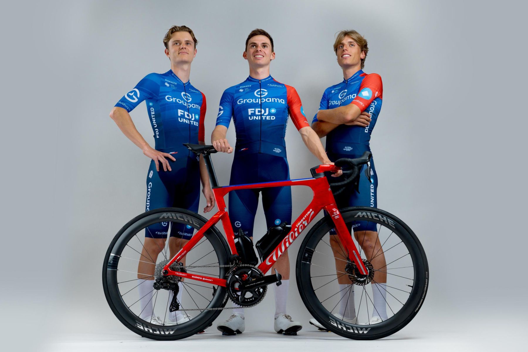 - Du côté de Groupama-FDJ United, le bleu et le rouge deviennent dominants, comme cela était le cas lors du dernier Tour de France. Le logo de FDJ change pour devenir FDJ United, du nom de la nouvelle entité de la loterie française.