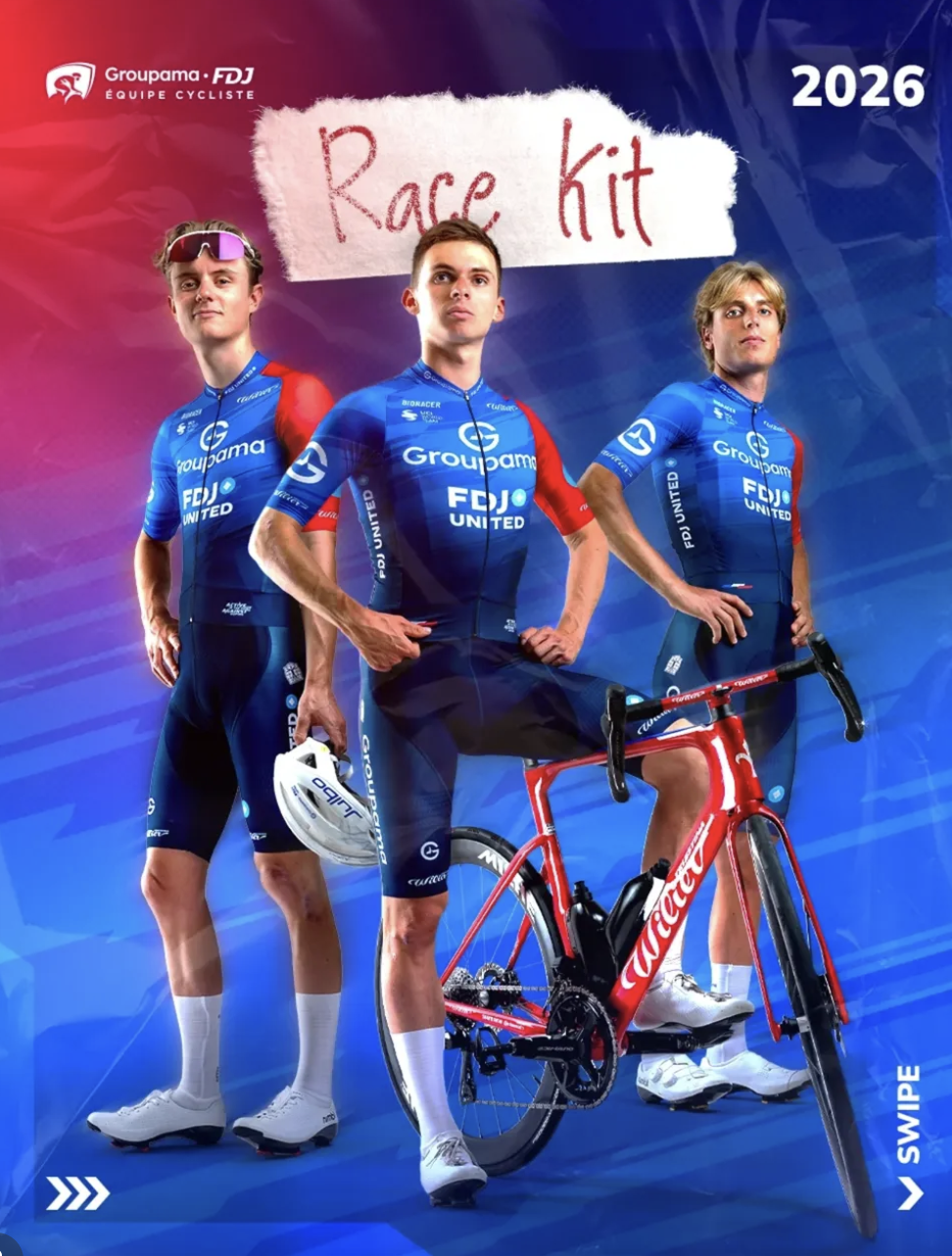 • Pour FDJ United-Suez, le maillot de 2026 ressemblera à celui proposé par l’équipe française sur le dernier Tour de France : plus de rouge et de bleu pour mettre en avant la nouvelle identité de la Loterie française, FDJ United.