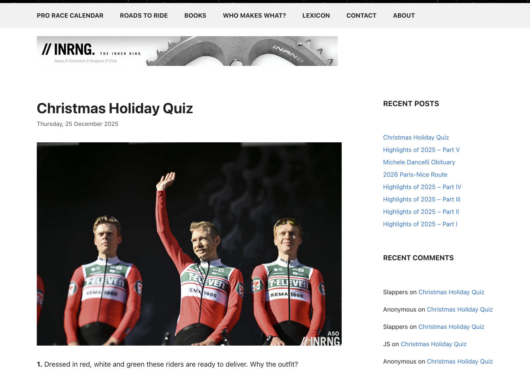 - Cela fait plus de quinze ans que je suis le blog The Inner Ring avec grand intérêt. Les analyses de ce passionné sont fines et remarquables, à tel point que l’identité de ce blogueur a longtemps interrogé, au vu de la qualité des informations diffusées. Il reste l’un des auteurs les plus avisés concernant le cyclisme sur route masculin, et propose de très bons conseils en termes de lectures ou de voyages. Je vous conseille également son questionnaire annuel de fin d’année, qui met K.-O. les meilleurs connaisseurs du peloton. C’est en anglais, mais cela vaut bien un suivi régulier. Le lien est à suivre par ici.