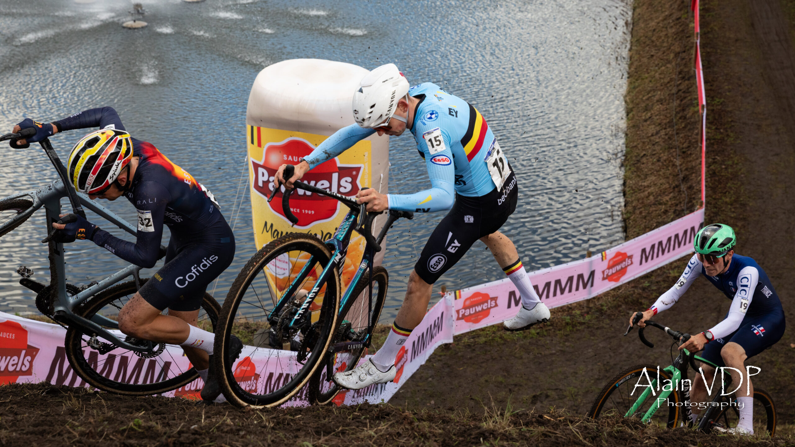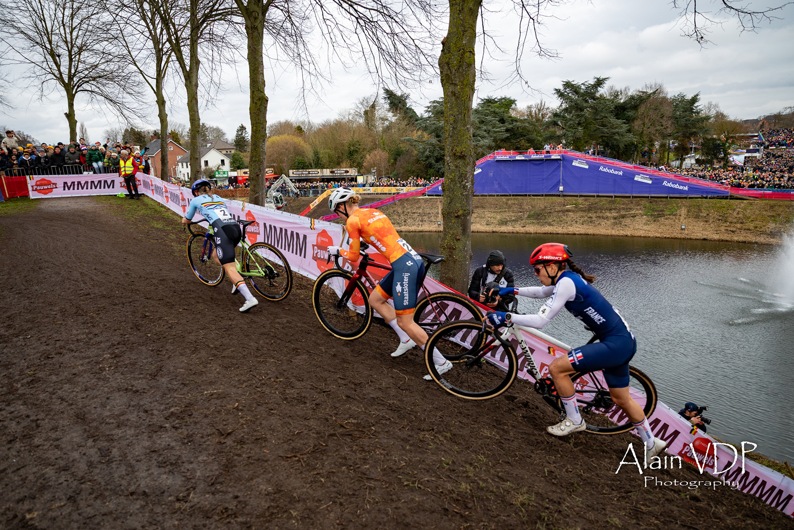 Les Néerlandais Mathieu van de Poel et Tibor del Grosso et le Belge Thibau Nys lors de la course des élites hommes des championnats du monde de cyclo-cross à Hulst, le 1er février 2026 – Photo : Alain Vandepontseele/Alain VDP Photography