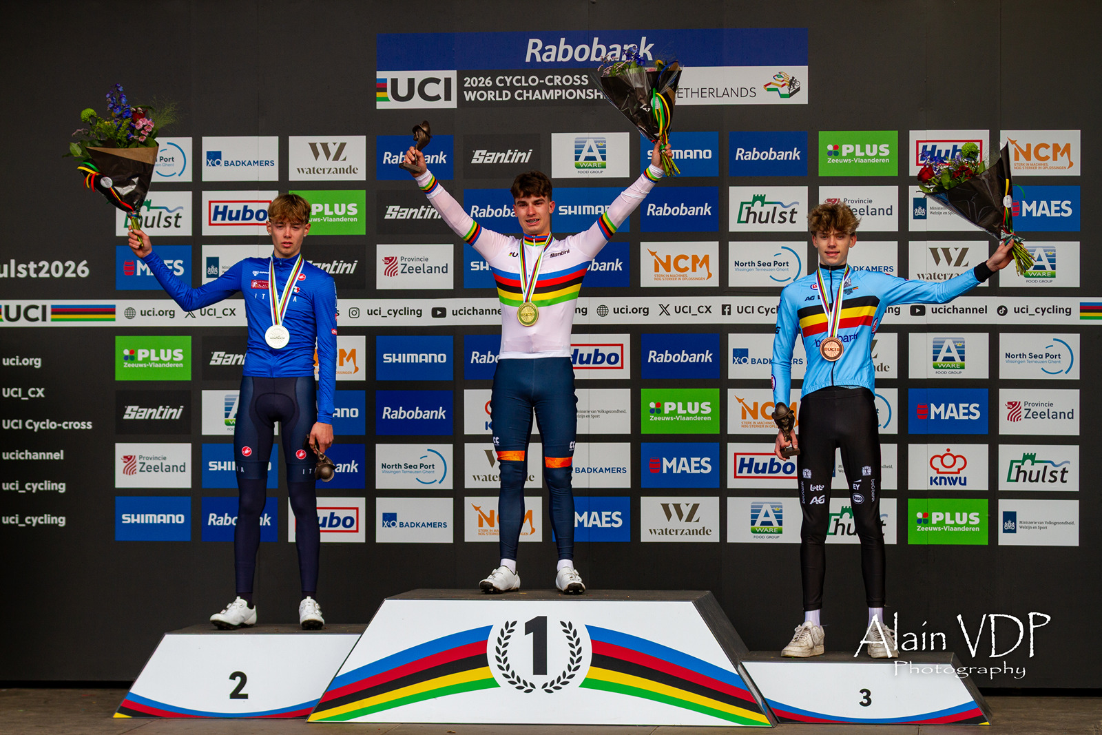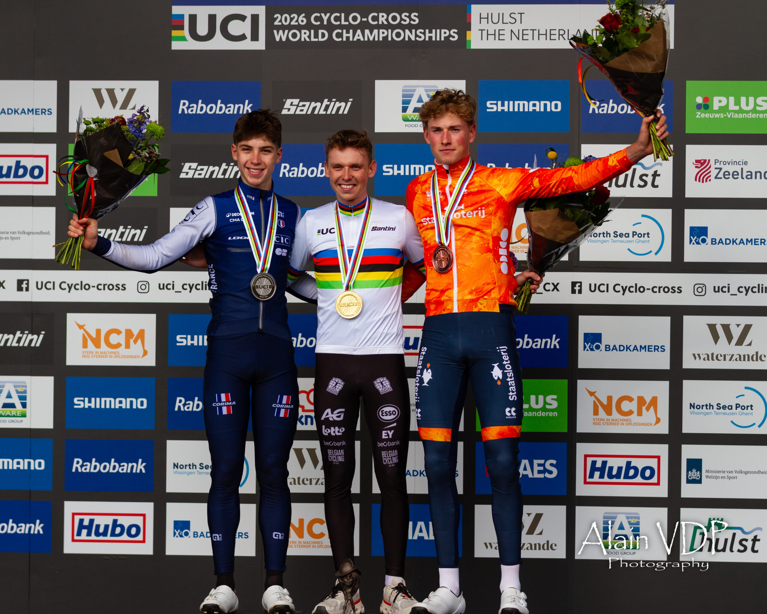 Le podium de la course des juniors hommes des championnats du monde de cyclo-cross à Hulst, le 1er février 2026 : l’Italien Filippo Grigolini, deuxième, le Néerlandais Delano Heeren, premier, et le Belge Giel Lejeune, troisième – Photo : Alain Vandepontseele/Alain VDP Photography
