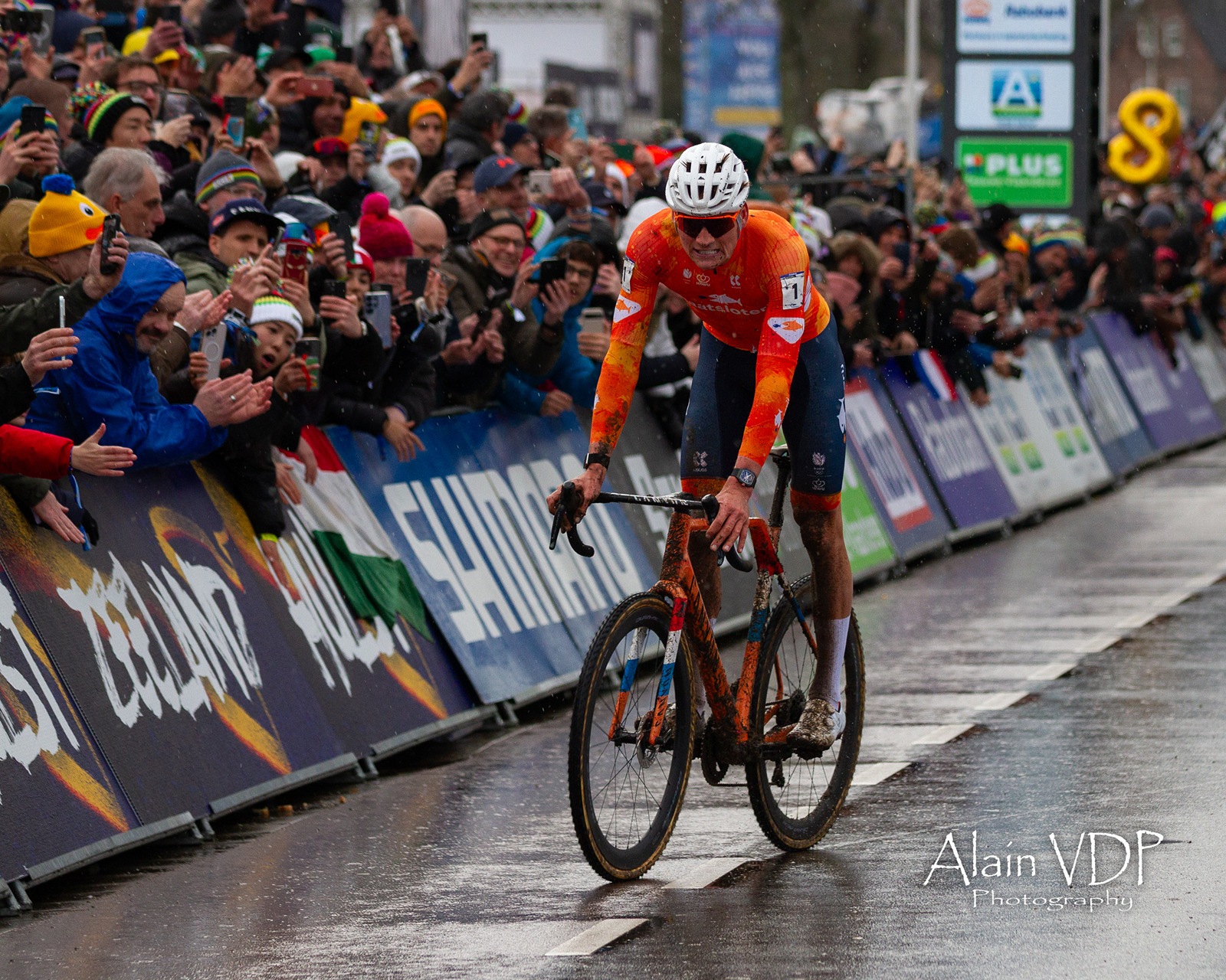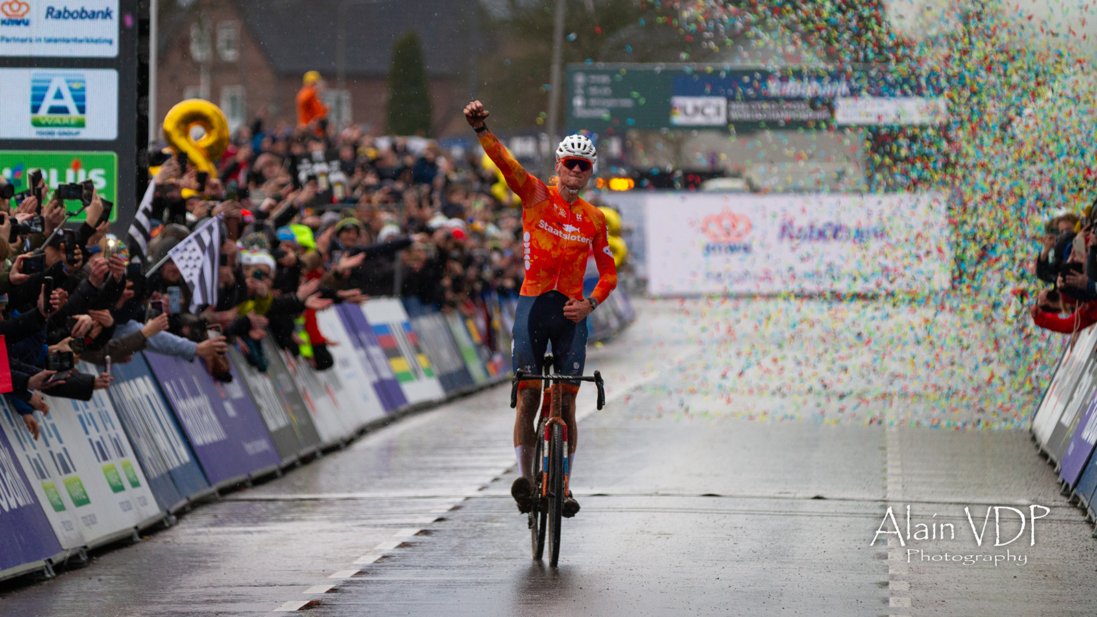 Un supporter célèbre le huitième titre mondial de Mathieu van der Poel sur la course des élites hommes des championnats du monde de cyclo-cross à Hulst, le 1er février 2026 – Photo : Alain Vandepontseele/Alain VDP Photography