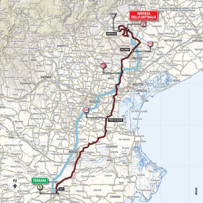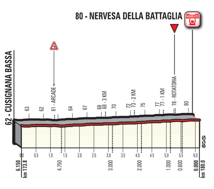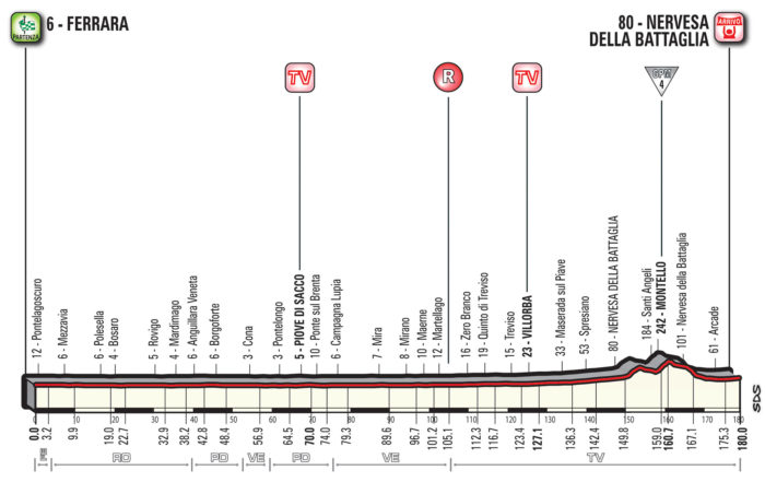 Dans la vallée du Pô, les spécialistes du sprint auront cette fois toutes les cartes en mains pour se défier dans la dernière ligne droite. Cette étape de plaine de 180 kilomètres ne propose qu’une butte à près de 20 kilomètres de l’arrivée mais la pente ne dépassera pas les 9 % et semble trop loin pour jouer un rôle en vue du final. En plus, la route empruntée jusqu’au centre de Nervesa della Battaglia ne présente aucun virage particulièrement dangereux pour une meute de cyclistes lancée à toute vitesse.