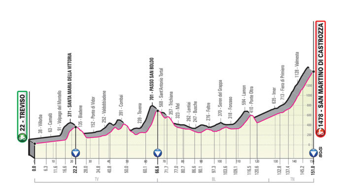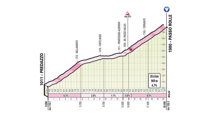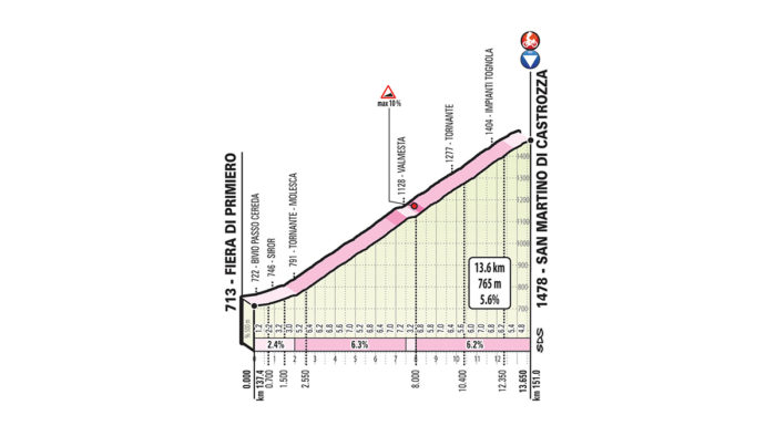 Comme d’habitude, le Tour d’Italie se terminera à flanc de montagne, avec une 19e étape attendue comme un feu d’artifice sur les pentes de San Martino di Castrozza (13,6 km à 5,6%). Et le lendemain, la 20e étape proposera une lutte pour le maillot rose des plus magistrales avec quatre cols qui font la gloire du Granfondo Dolomiti Race : le Cima Campo (18 km à 6%), le Passo Manghen (18,9 km à 7,6%), le Passo Rolle (20,6 km à 4,7%) et le Monte Avena (13,5 km à 6,3%). Bref, du costaud avant le contre-la-montre final à Vérone.
