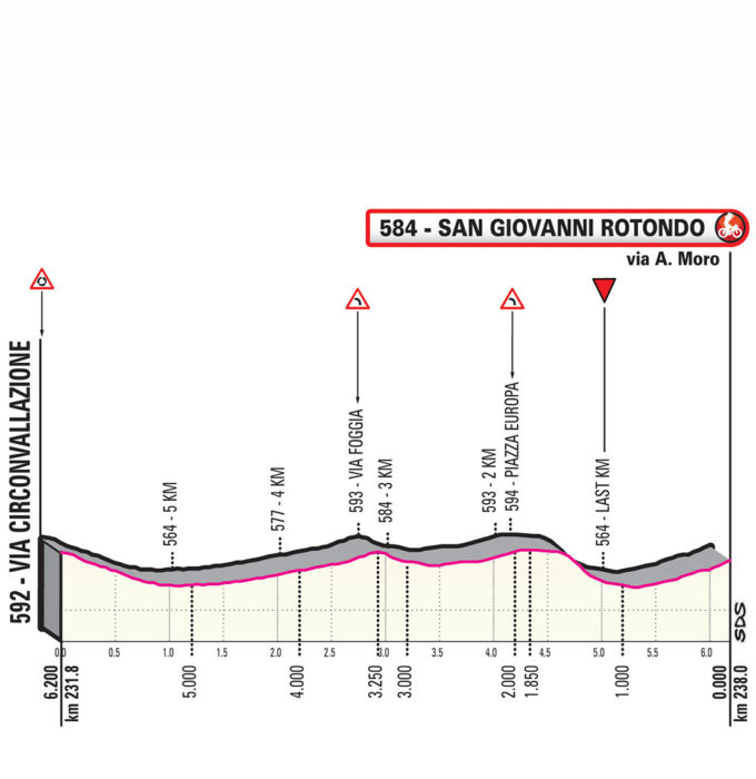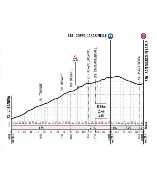 Avec 238 kilomètres au compteur, il s’agit de la deuxième plus longue étape de ce Tour d’Italie, avec en prime un final bien corsé. Après 190 bornes sur des routes rapides et sans grande ascension, le peloton va affronter à l’approche de San Giovanni Rotondo des routes plus étroites et sinueuses. Avec, comme point d’orgue, la montée de Coppa Casarinelle avec ses épingles à 4,4% de moyenne sur 15 kilomètres. Il restera alors une quinzaine de kilomètres jusqu’à l’arrivée, avec un festival de faux-plats montants et descendants jusqu’à l’arrivée. La ligne droite finale sera idéale pour des coureurs puissants, avec un dernier kilomètre à 2-3%.